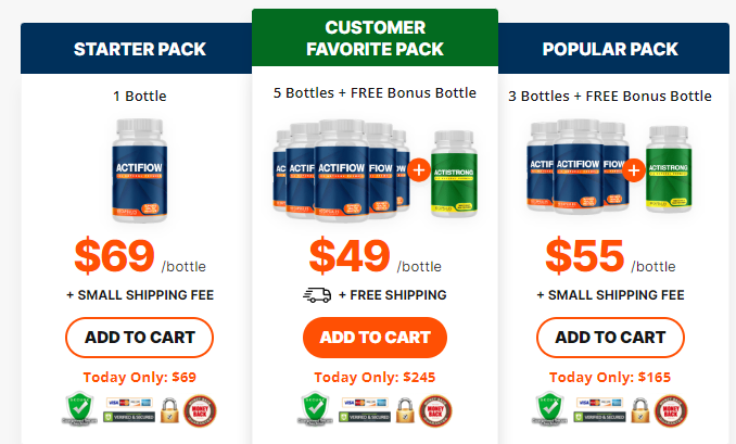 Five bottles of Actiflow Supplement for $49, each bottle. Free Us Shipping ( 180 day supply) Plus free Bonus bottle.