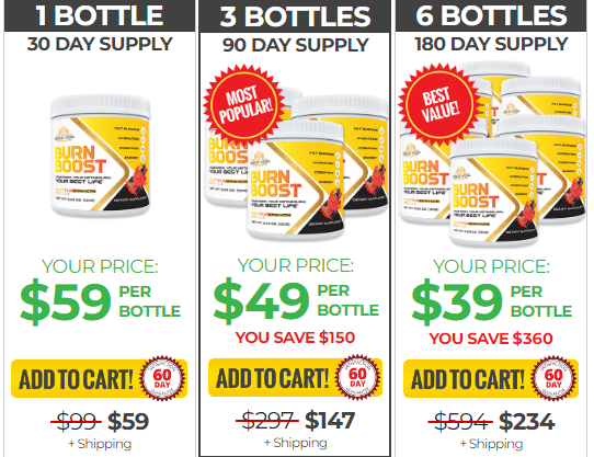 Six bottles of Burn Boost Supplement for $39, each bottle. Plus small shipping charges (180 day supply)