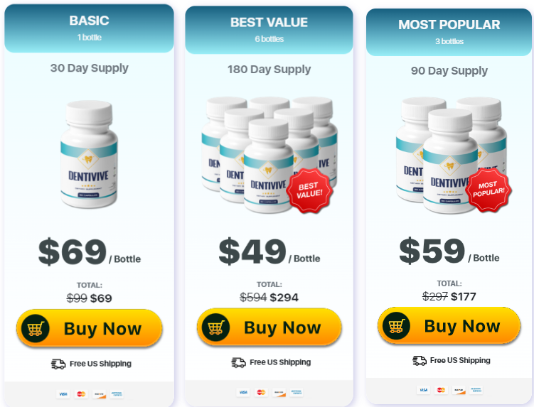 Three bottles of DentiVive Supplement for $59, each bottle.Free Us Shipping ( 90 day Supply)