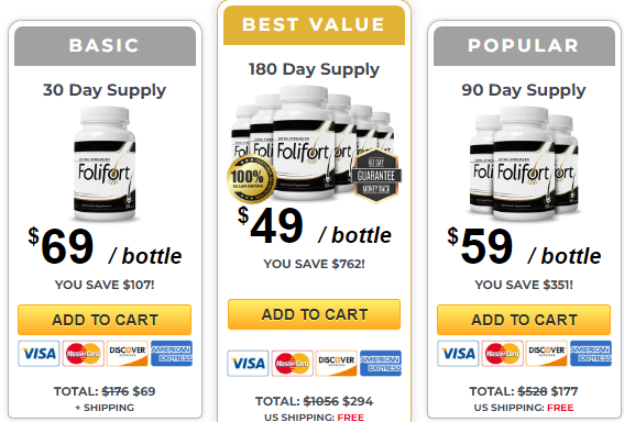 Three bottles of Folifort Supplement for $59, each bottle. Plus small shipping charges (90 day supply)
