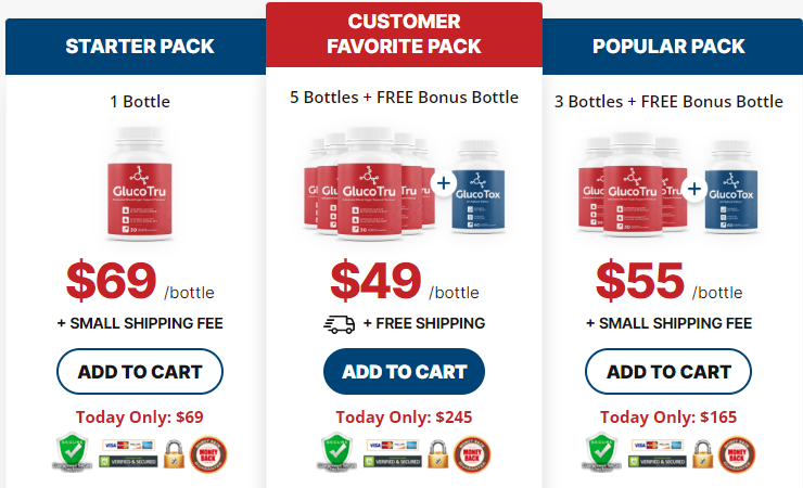 Three bottles of GlucoTru Supplement for $55 each, Plus small shipping fee (90 day supply) One Free Bonus Bottle