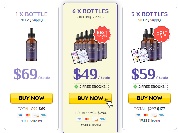 Three bottles of Honey Burn Supplement for $59, each bottle. Free Shipping (90 day supply) 2 Free Ebooks