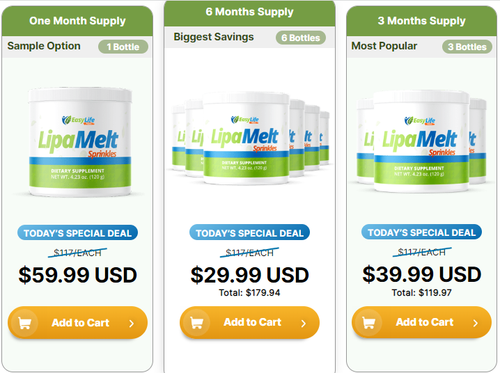 Six bottles of LipaMelt for $29.99 each bottle, ( 180 day supply)