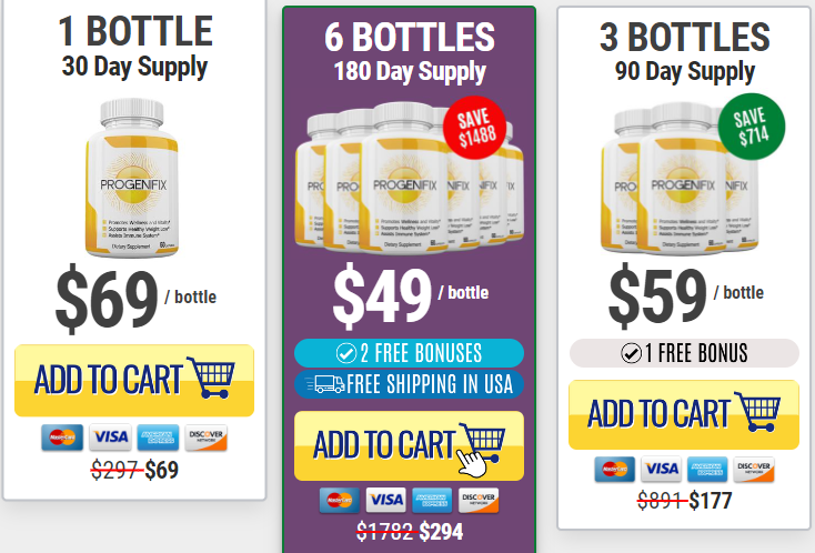 Three bottles of Progenifix Supplement for $59, each bottle, Free Us Shipping (90 day supply) one free Bonus.