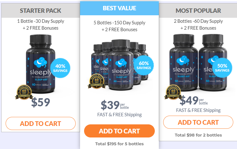 Five bottles of Sleeply for $39, each bottle, ( Best Value Package) (150 day supply) + 2 free Bonuses. ( Free Shipping)